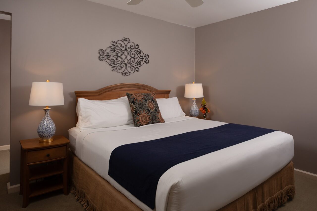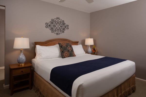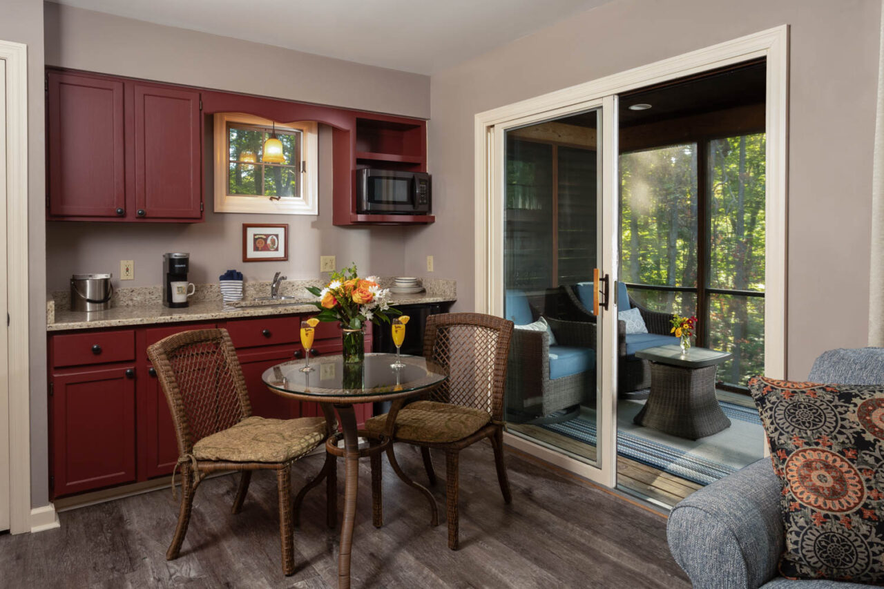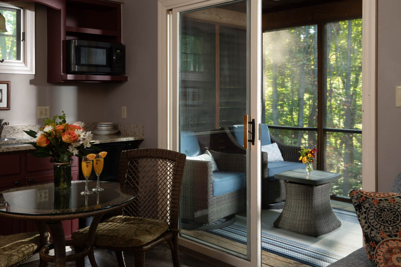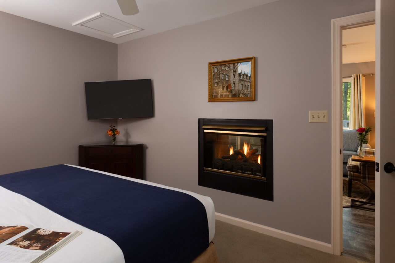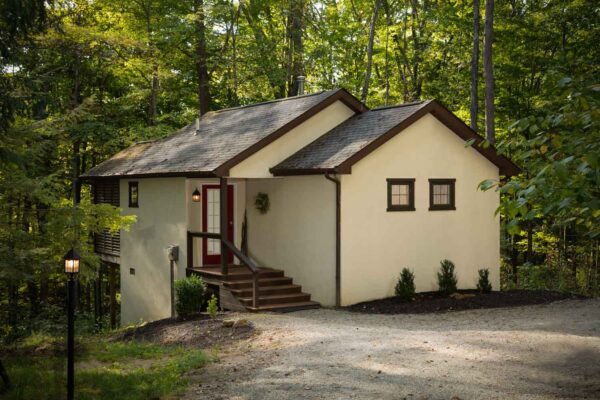 One of our four East Crofts, the Drummond was one of the first crofts built at Glenlaurel. Clan Drummond’s ancestral home is a Kildrummie Castle near Aberdeen on the east coast of Scotland. Decorated in cream and deep red, The Drummond Croft has a kitchenette area with a dining table for two, living room which features large picture windows to the woods and has sliding glass doors that lead to a private screened-in porch. A bedroom with a see-through gas log fireplace between the cozy bedroom and the living room sets a romantic mood.