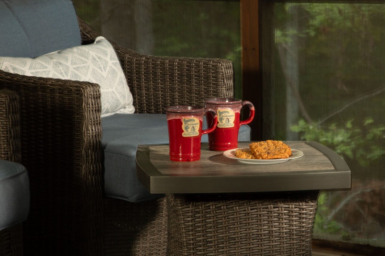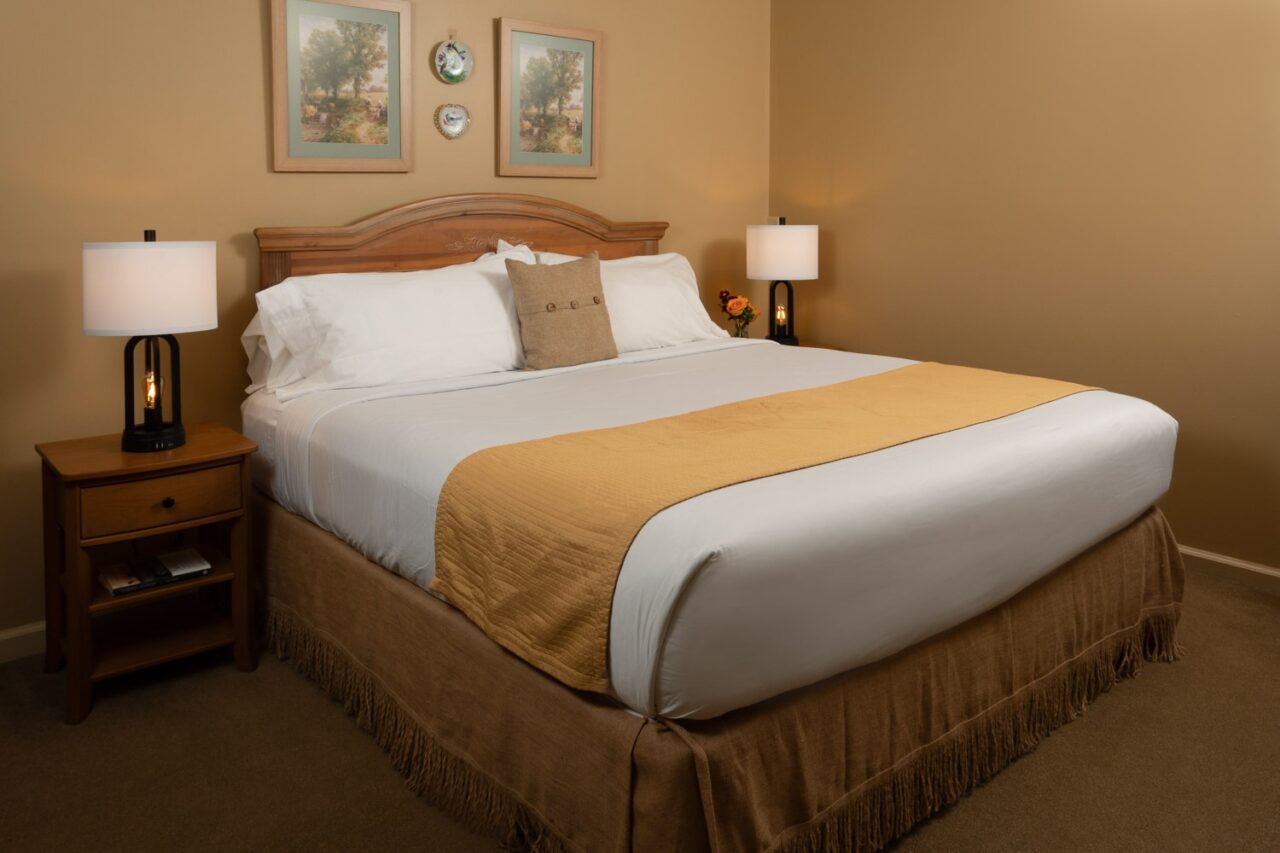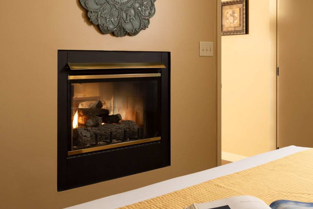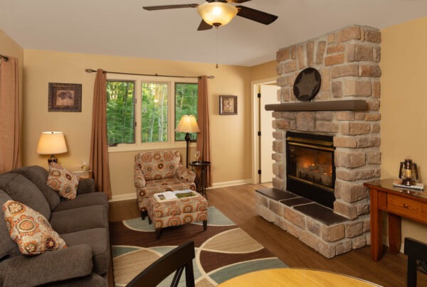 In the Elliot Croft, a see-through fireplace between the cozy bedroom and the living room sets the mood. A kitchenette area with a dining table for two and a bathroom with a two-person shower completes the space. The living room features large picture windows to the woods and has sliding glass doors that lead to a restful screened-in porch and a private deck with a hot tub.