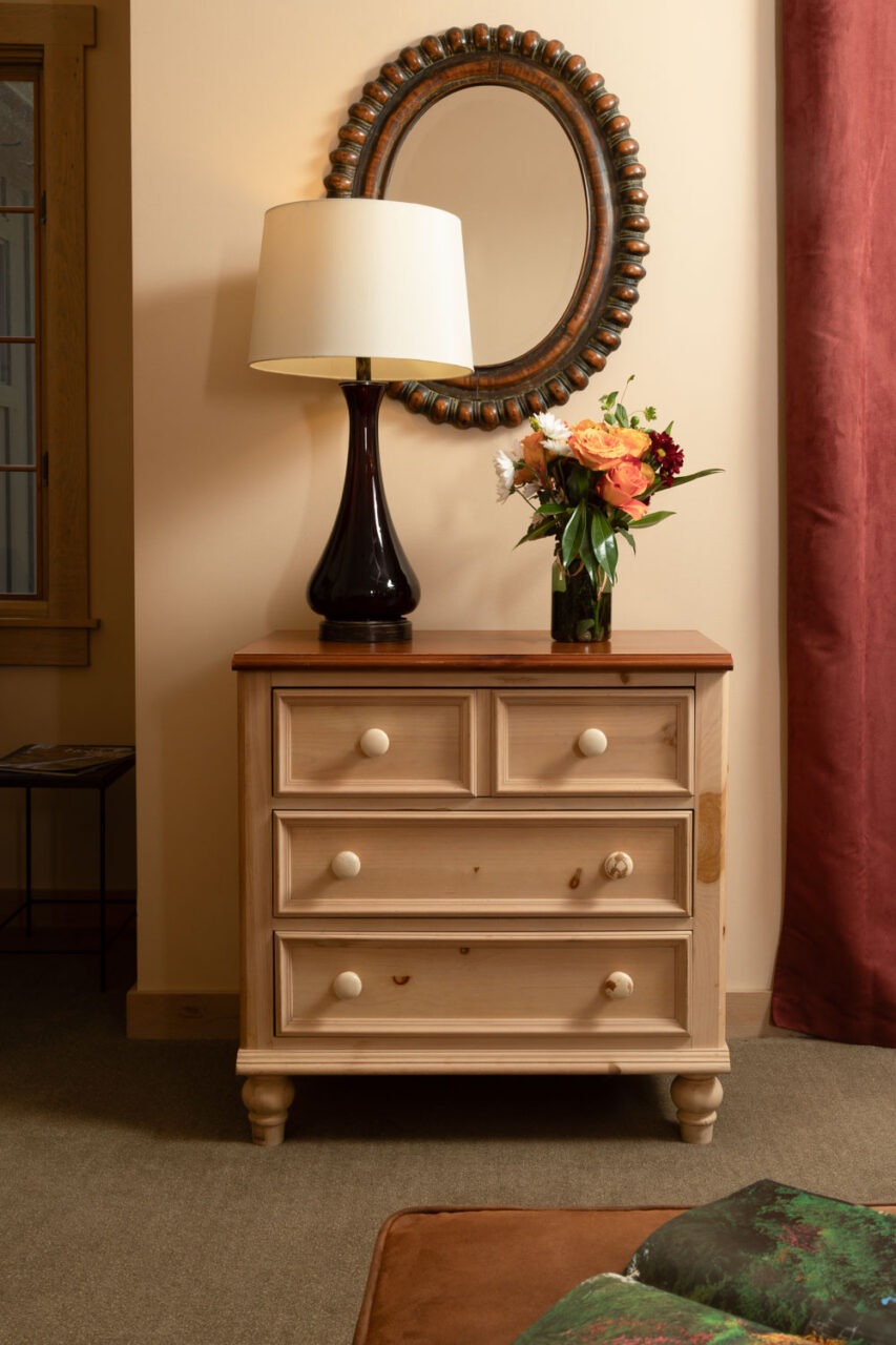 The master bedroom has a welcoming king bed, a plush lounge chair, and six-foot windows to the east for the morning sun and indirect lighting with provocative capabilities. Past the walk-in closet is an oak-floored bathing lounge with corner two-person whirlpool tub below windows with treetop views; a suite unto itself. The MacDonald is truly estate living at its finest and is the only place in the Manor House for those with lots of stuff needing lots of room!