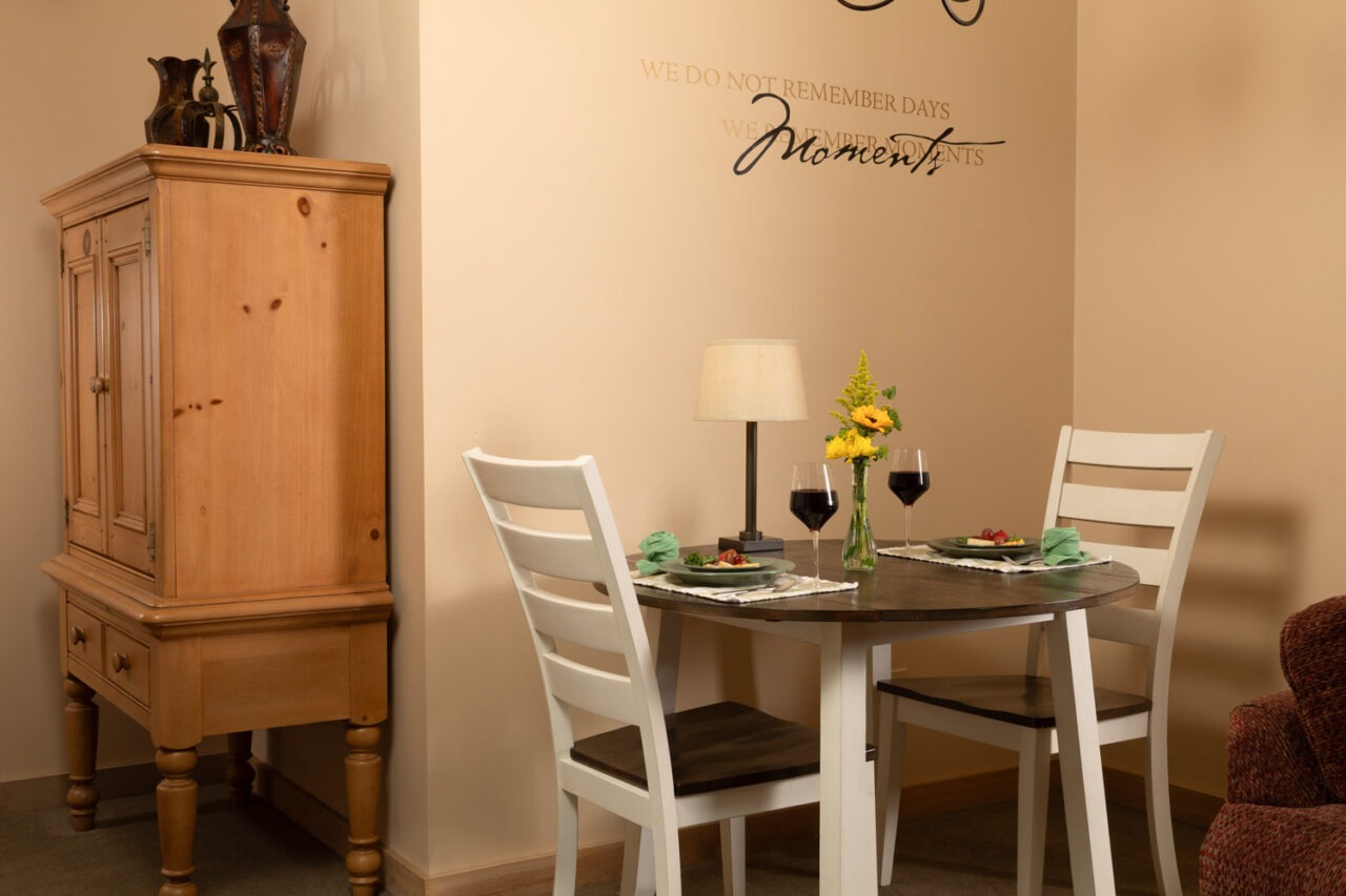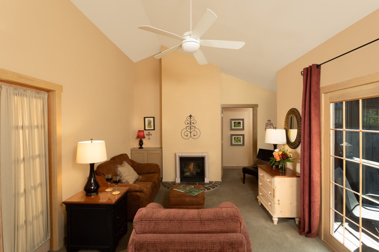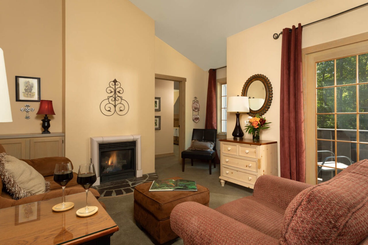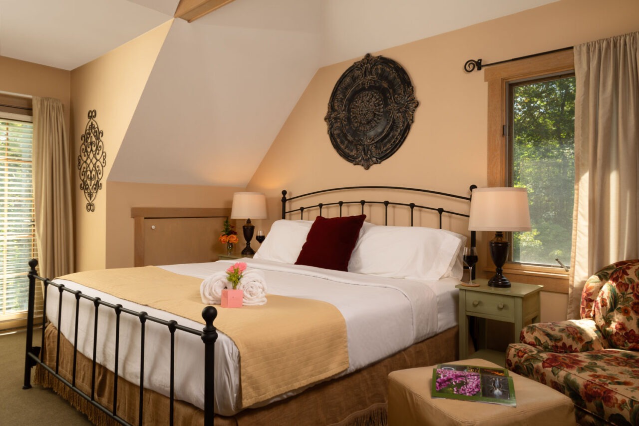 Inspired by ancient memories of the owner’s quarters at the original MacTavish Inn, the MacDonald is in fact the Master Suite at Glenlaurel. Located on the second floor of the Manor House, the two-room suite has a commanding southerly view of the Grand Deck and Wedding Gardens. The living room/dining room combination has a gas log fireplace, small balcony, cathedral ceilings, and large windows.