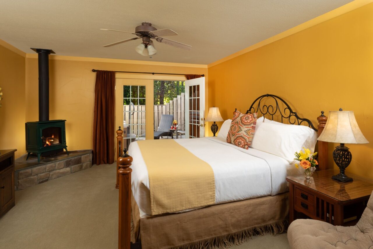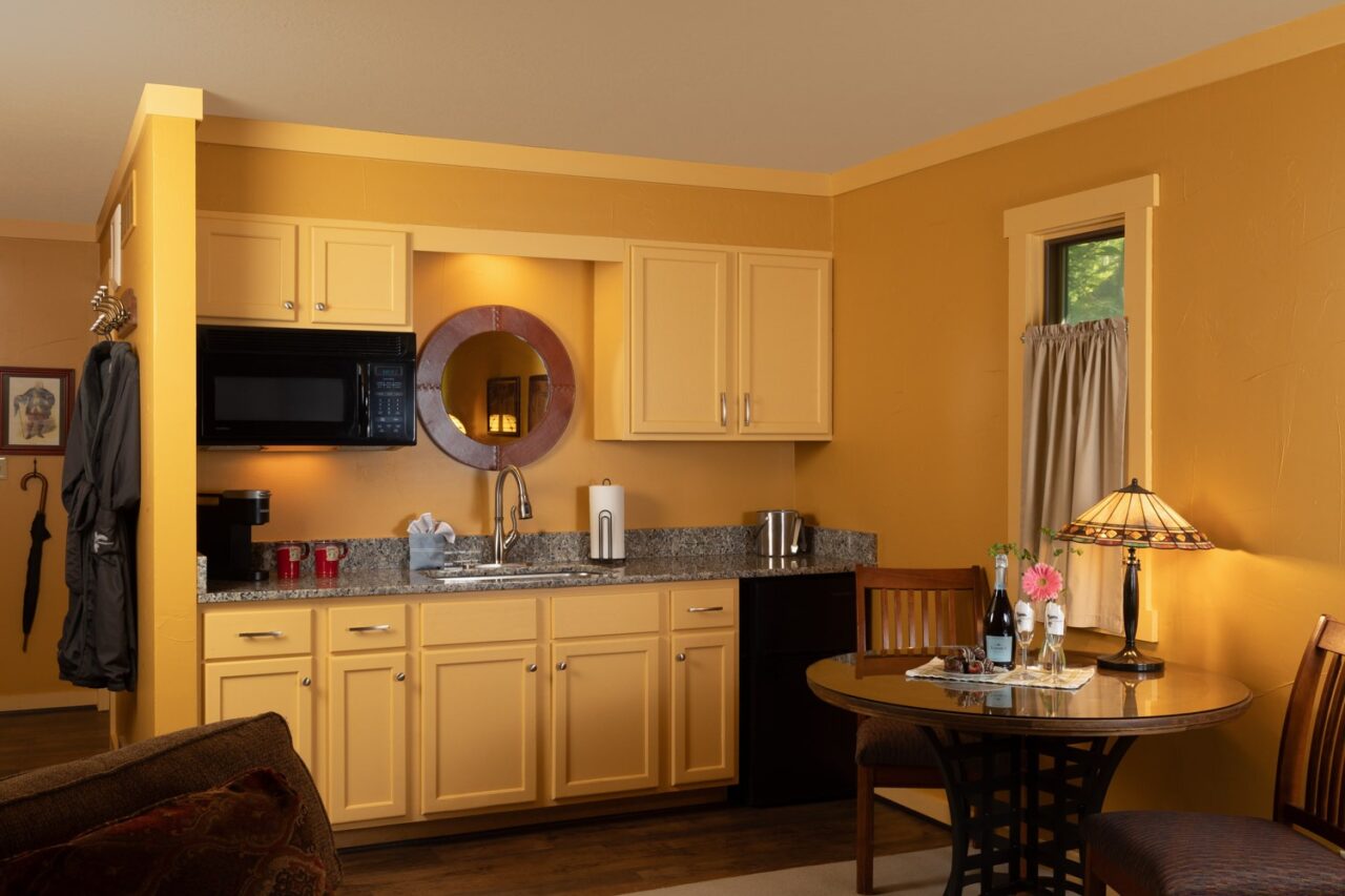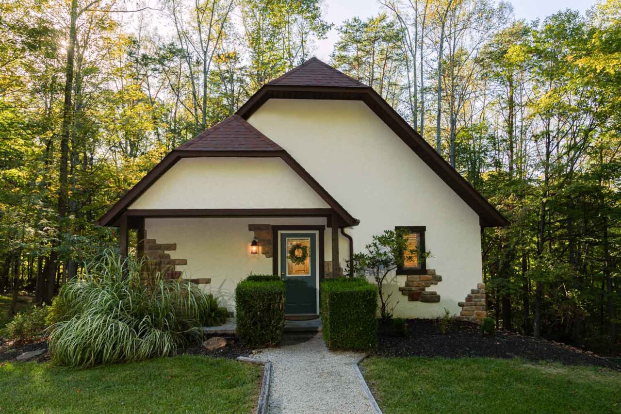 The spacious bath suite has a walk-in closet, vanity prep for two, and all the necessary bath amenities. The inner bath suite has a shower stall and other necessities. You can enjoy the warmth of two fireplaces (one in the sitting area and the other in the bedroom), especially on a snowy Hocking Hills evening. Venture into the bedroom, and you will find a King-sized bed and private hot tub when you open the double French doors. Your senses will delight in the warmth of an anticipated hot tub soak and the quiet sounds of nature. Reserve one of Glenlaurel’s relaxing cottages in Hocking Hills, Ohio today!
