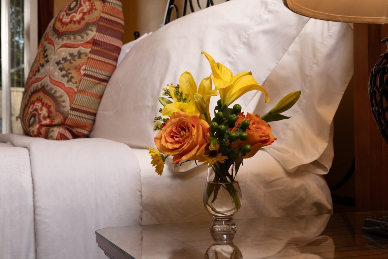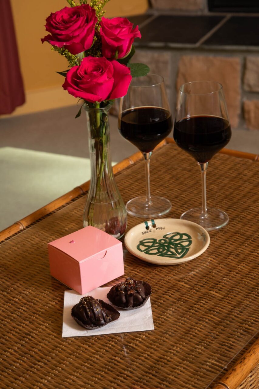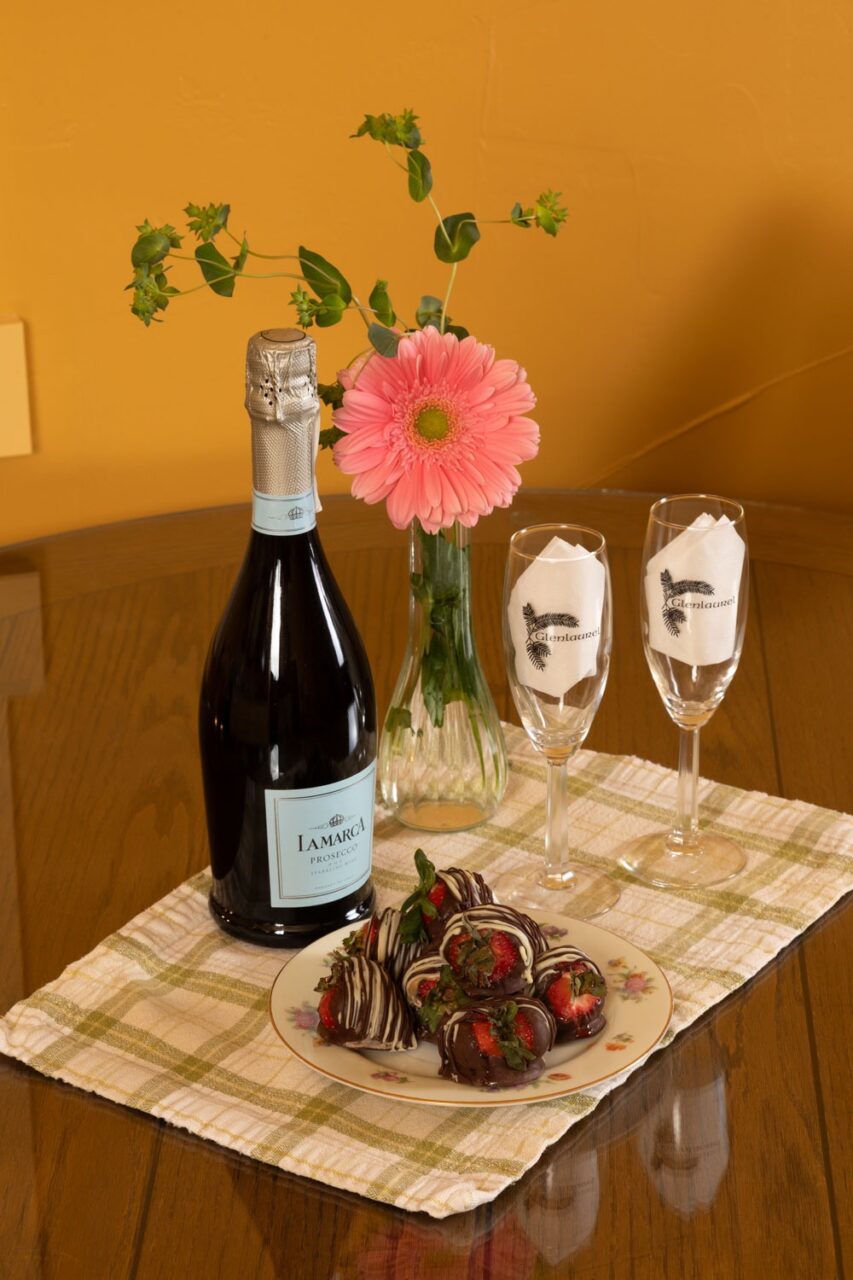 The spacious bath suite has a walk-in closet, vanity prep for two, and all the necessary bath amenities. The inner bath suite has a shower stall and other necessities. You can enjoy the warmth of two fireplaces (one in the sitting area and the other in the bedroom), especially on a snowy Hocking Hills evening. Venture into the bedroom, and you will find a King-sized bed and private hot tub when you open the double French doors. Your senses will delight in the warmth of an anticipated hot tub soak and the quiet sounds of nature. Reserve one of Glenlaurel’s relaxing cottages in Hocking Hills, Ohio today!