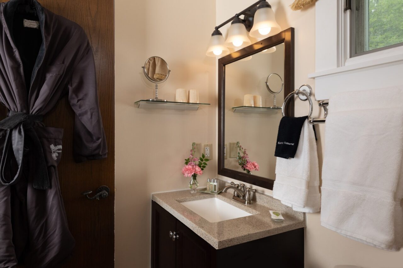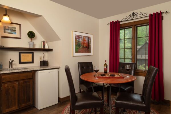 Escape to the Highlands with a stay in the Robertson Garret room at Glenlaurel, A Scottish Inn & Cottages. This Garrett, which is another name for attic, is located on the second floor of the Carriage House. It has a romantic ember glow electric fireplace, a private bath with a tub/shower combo, a King-sized bed, and an easy chair for reading. The tall windows in the Robertson Garrett offer an enchanting view of the lush treetops and the majestic Camusfearna Gorge, inviting you to unwind, relax, and bask in the beauty of nature. The beauty of the seasonally changing flora makes for perfect Ohio getaways for couples. There is also a charming shared sitting area and kitchenette (shared with the Mar).