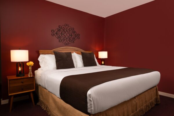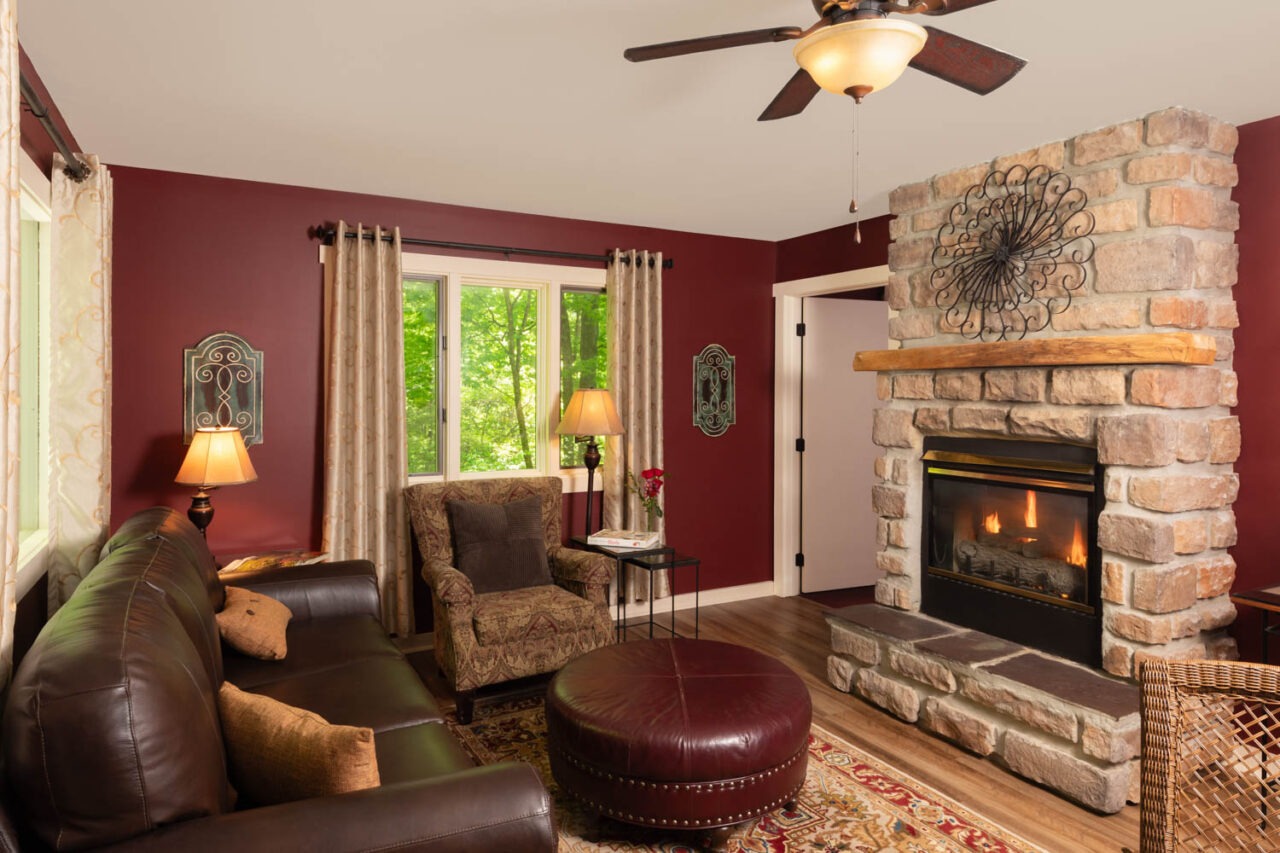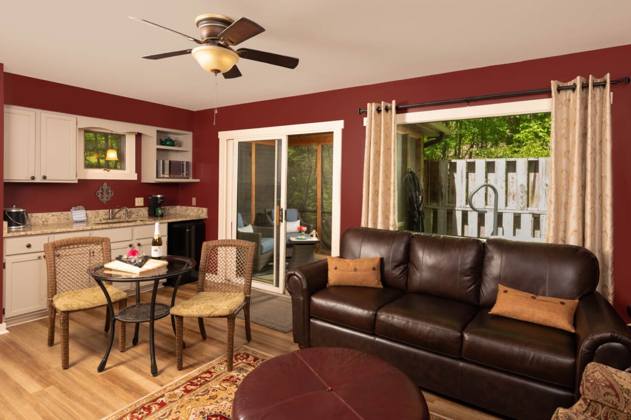 One of the four East crofts, the Sinclair has a luxurious leather sofa in a rich earthy tone that enhances the living room, which is decorated in shades of beige, cream, and burgundy. As the other three East Crofts, the Sinclair has a kitchenette, living room, and bedroom with gas log fireplace that faces both rooms.