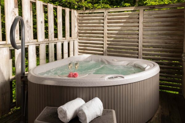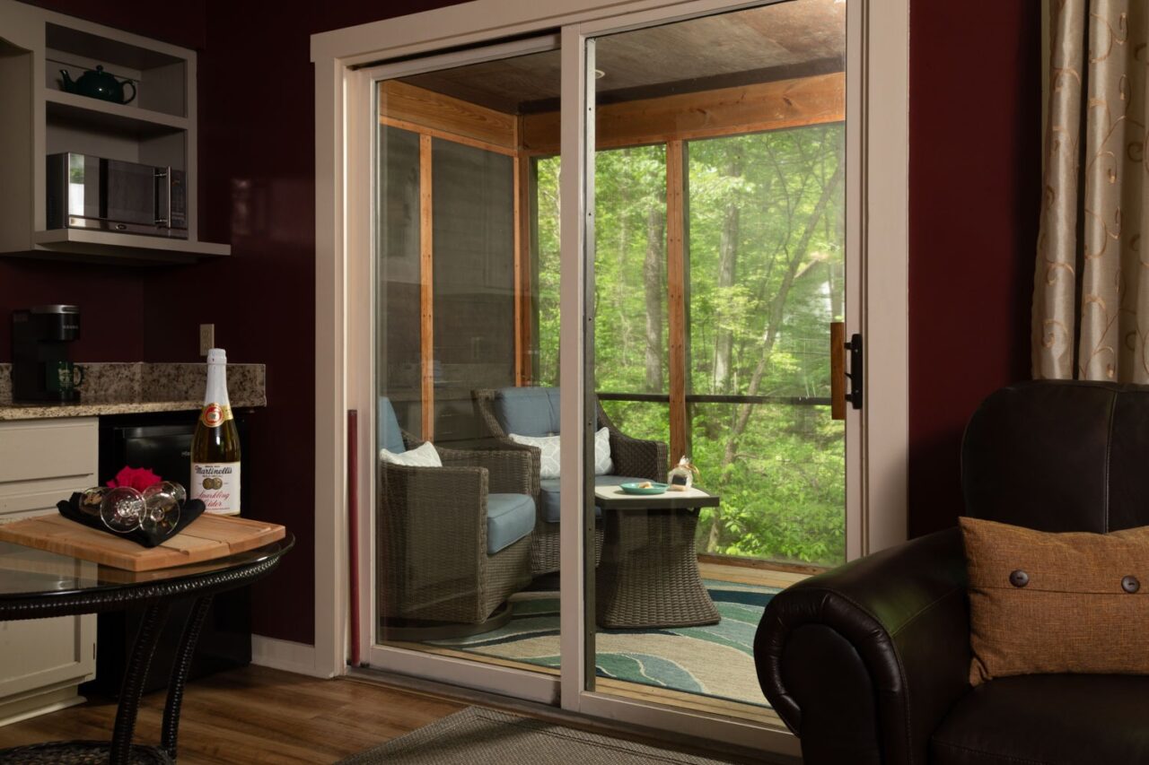In the Sinclair Croft, a see-through fireplace between the cozy bedroom and the living room sets the mood. The living room features large picture windows to the woods and has sliding glass doors that lead to a restful screened-in porch and a private deck with a hot tub. The Sinclair Croft has a kitchenette area with a dining table for two. The hot tub is on a private deck overlooking the gorge. The screened porch is another tree house awaiting lovebirds looking for relaxation. The bath has two-person shower stall, luxurious bathrobes, and extra Egyptian cotton towels.