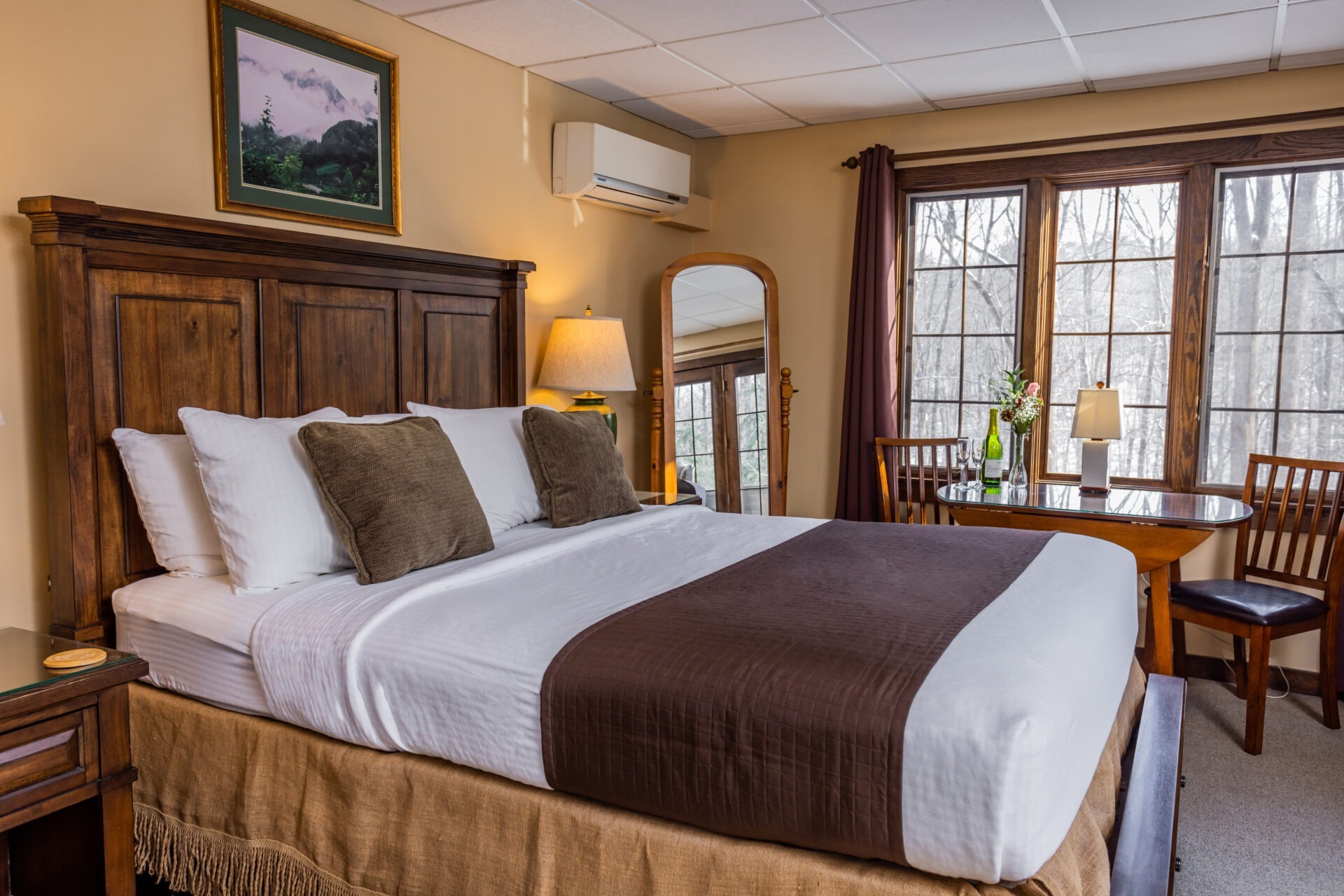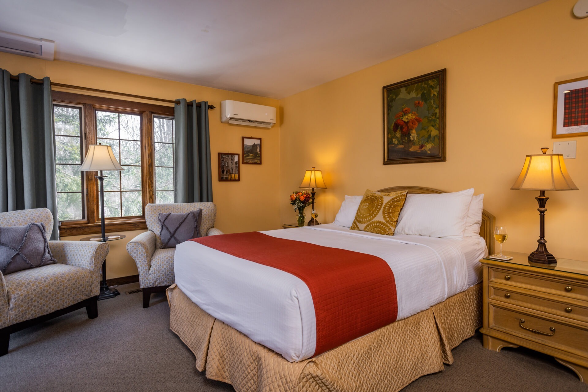 Situated on the first floor of the Manor House, this lovely room has a two-person whirlpool tub in the bath, gas-log fireplace in the bedroom, and cozy deck facing south…