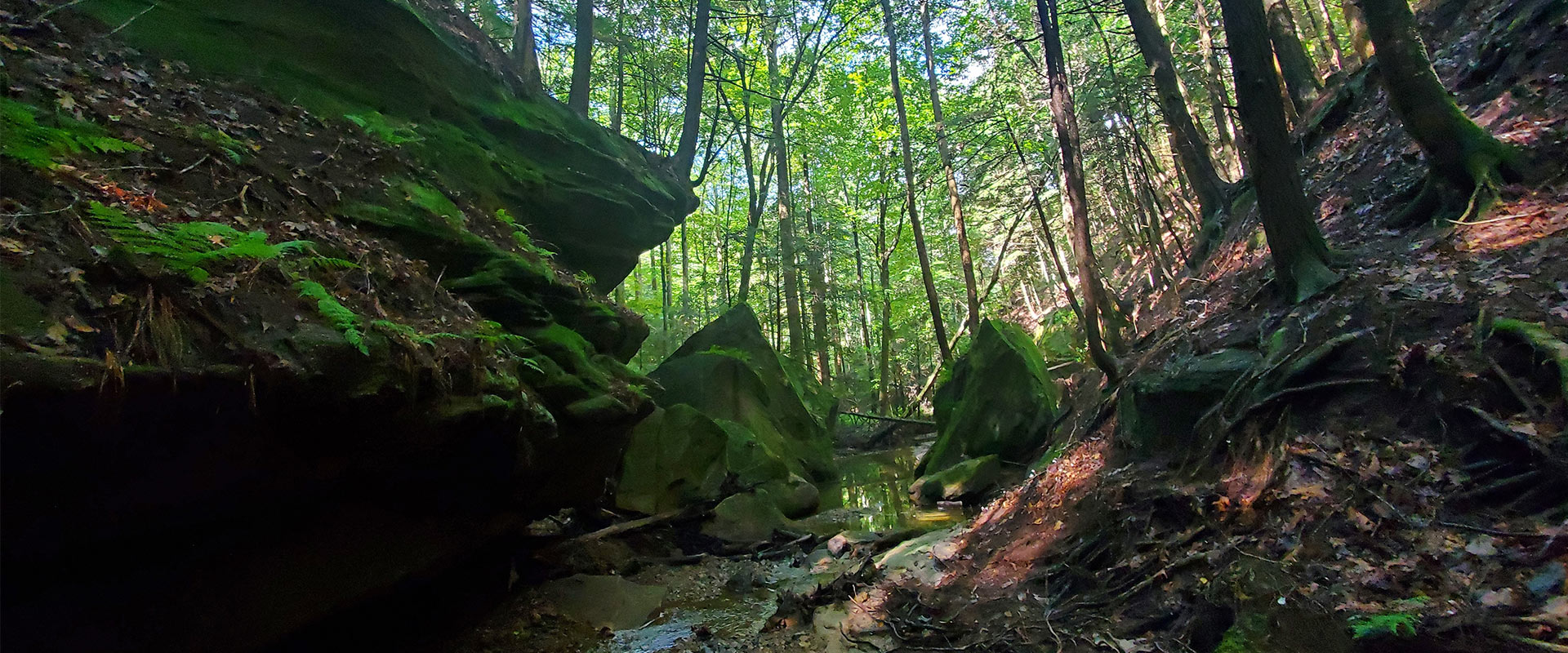 The local topography is very hilly and broken by deep ravines and steep precipices. The gorge, which is located on our private estate, is a timeless place that changes with every season. The heavily wooded series of walking trails, rock cliffs, and waterfalls showcase the most astonishing and beautiful trails, both on the Camusfearna Gorge Trail, the Highland Scott’s Trail, and Thistle Bluff Walk. These trails offer beautiful rock formations with 50-100 foot rock cliffs, caverns, two creeks, and waterfalls. The gorge trail is a leisurely 1 1/2 hour (half-mile) hike that has several breathtaking waterfalls and many other wonderful landmarks: Throne Court, Big Ben (a centuries-old pine), Turkey Point, Jurassic Crossing, and Dripping Rock Cave… just to name a few.