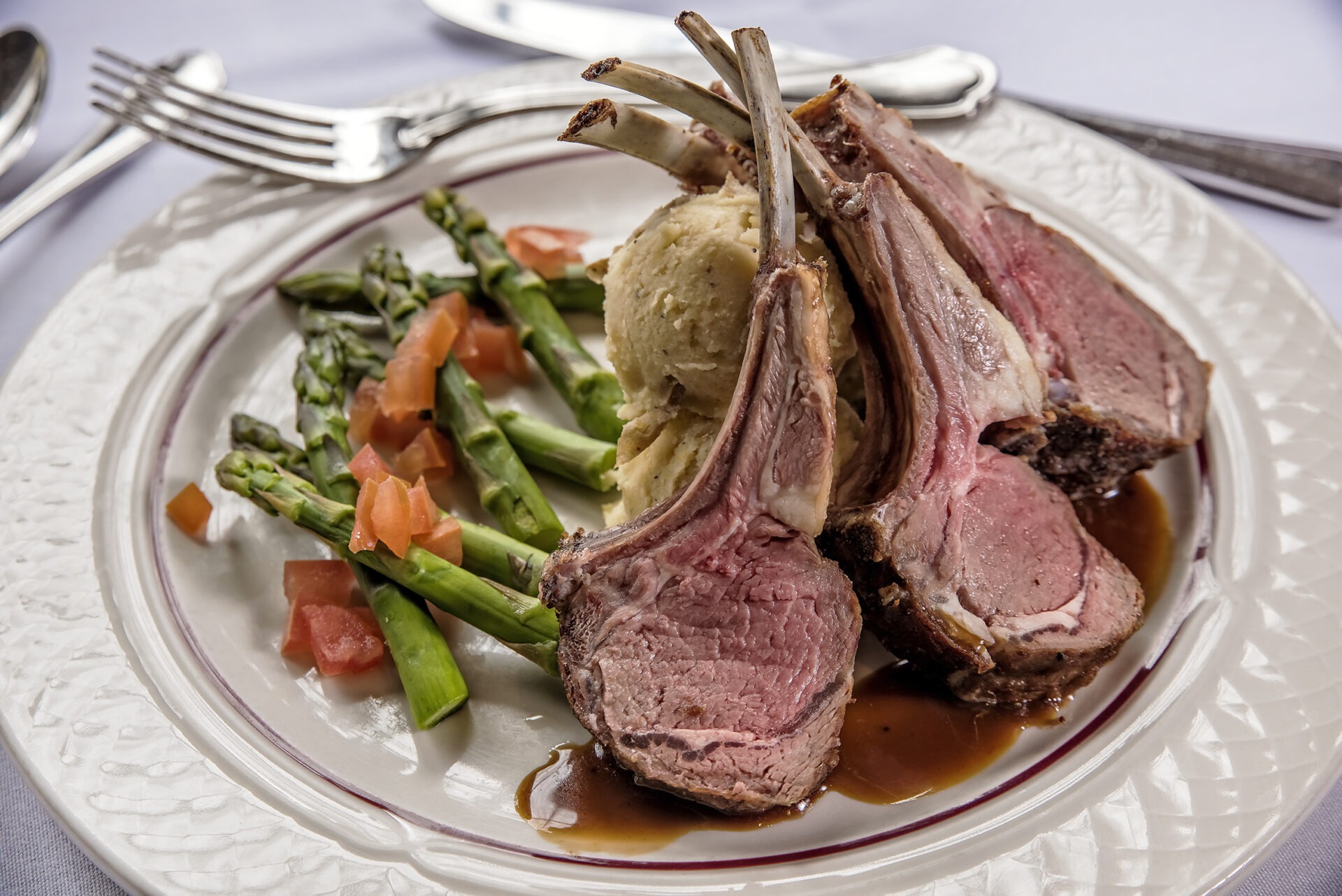 The seven-course dinner expands upon our weekday menu with the inclusion of the feature Rack of Lamb or optional other protein choices. Courses include an amuse-bouche, house-made soup, seasonal salad, refreshing sorbet, dual entrées, and a decadent dessert prepared in-house.