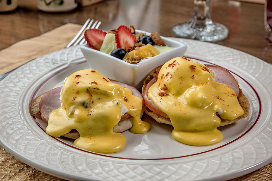 Begin breakfast with a freshly made scone, followed by our famous porridge. Then indulge yourself in the day’s featured breakfast entrée which may consist of Belgian Buttermilk Waffles with Blueberry Compote, Egg & Cheese Frittata with ham & asparagus, or hearty Eggs, Benedict. Crisp-peppered bacon or plump breakfast sausage, and fresh fruit complete your morning feast. . Whatever the selection, you won’t start your day hungry.