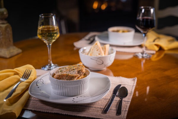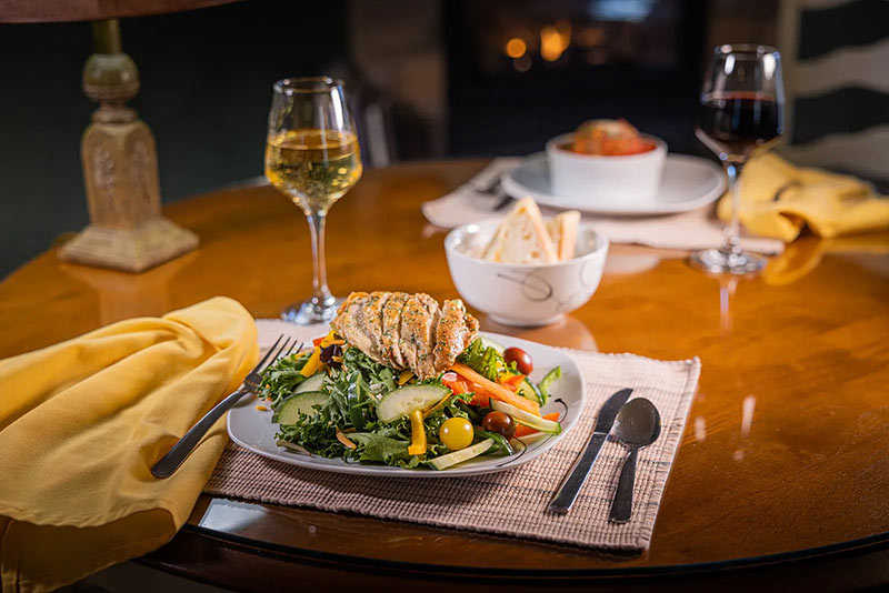 All dinner entrees (except entrée salads) are served with a side salad, rolls with butter, dessert, and beverage of choice. Beverage choices: Coke, Diet Coke, Sprite, Ginger Ale, and bottled spring water. Gluten Free: Add $8. To order your delicious dinner, contact Guest Services at ext. 333. We do require a 24-hour notice for in-room dinner orders. Check out details regarding our other dining options such as breakfast, picnic lunches, and happy hour!