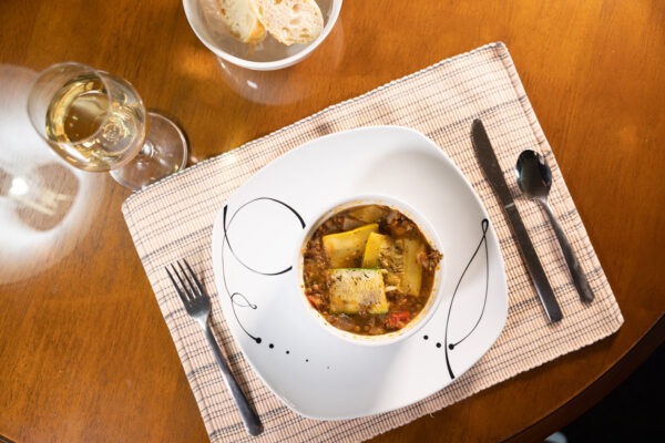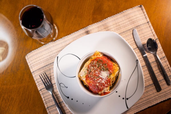 Lasagna of beef and pork with layers of ricotta, pasta, and basil marinara.