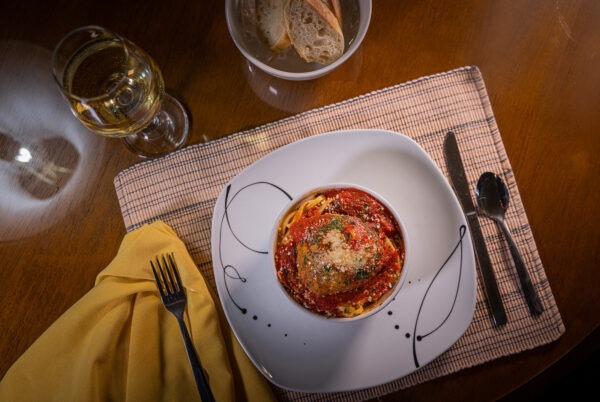 Jumbo meatball made with ground beef and veal mixture over linguini pasta covered with our Glenlaurel homemade sauce.