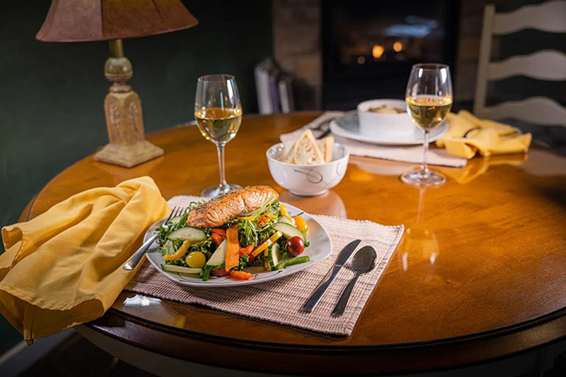 All our gourmet in-room dinners are made from scratch and prepared in our kitchen using the freshest ingredients available. We deliver your meal and set up your quaint table for two to await your arrival. In-room dinners are placed in the guest accommodation refrigerator to be heated at your leisure, with microwave heating instructions provided. If you’re looking for cozy dining option for your upcoming stay, our in-room dinner is the perfect choice. To make it even more special, we include a poetry scroll to enhance the romantic experience!