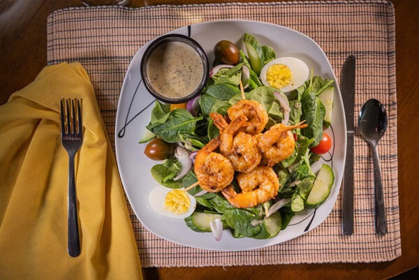 Six pieces of shrimp with Old Bay Seasoning over a bed of spinach and garnished with cherry tomatoes, cucumber, hard-boiled eggs, red onion, and chopped bacon pieces.